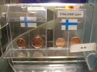 Finland, as is well known, is on the euro, but unlike other places they do not use the one or two cent coins. Instead, at each tourist shop and airport, they put these in little bags together and sell them for 3, 5, or even 8 euros. (in photo at left) What a country! Finland is a strange place and because of some disheartening events I will most likely choose not to return.